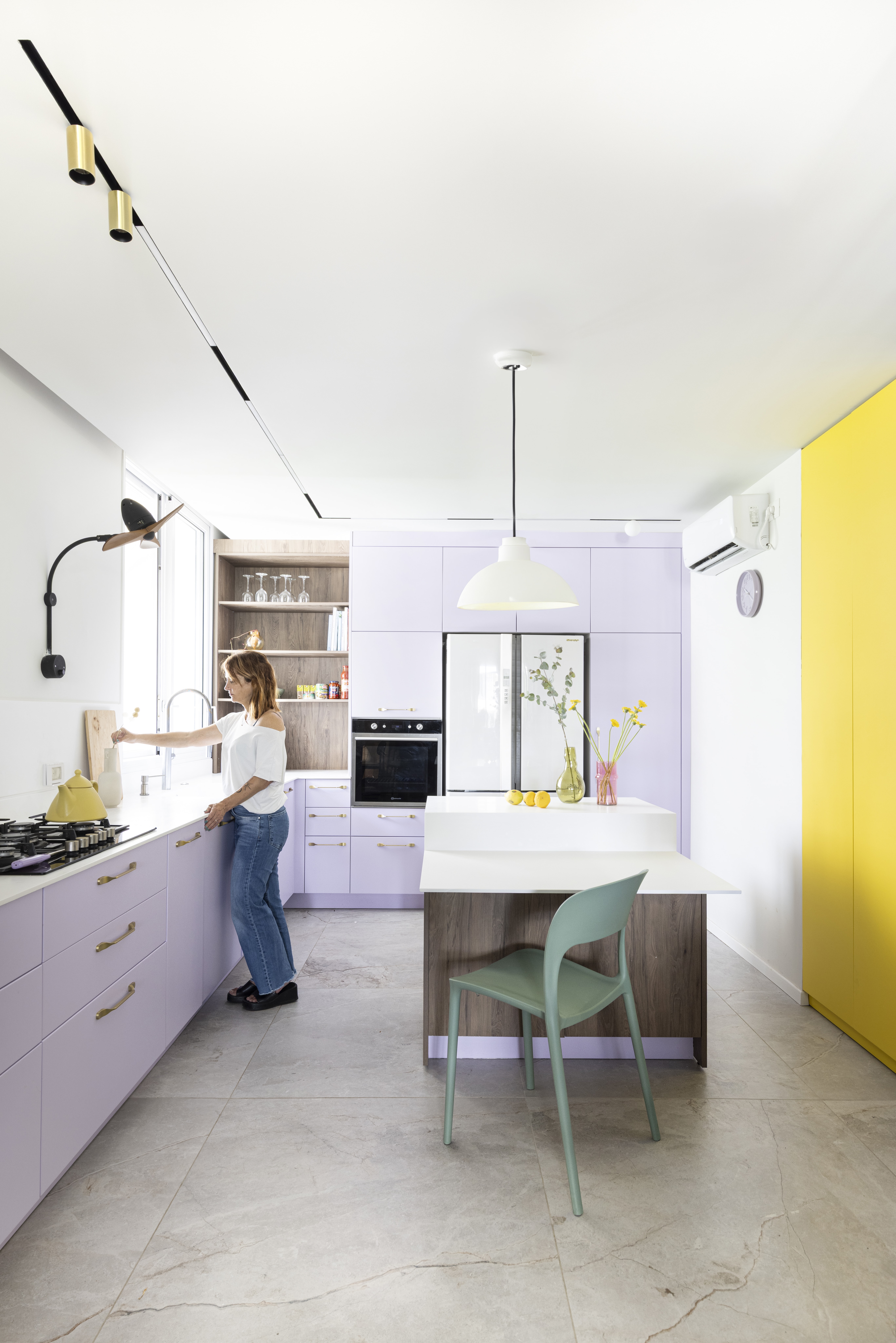 המטבח הוא לב הבית – תוכנן במיוחד לצרכים של רביטל שאוהבת לבשל, וכמובן – בגווני הסגול והצהוב שהיא חלמה עליהם.